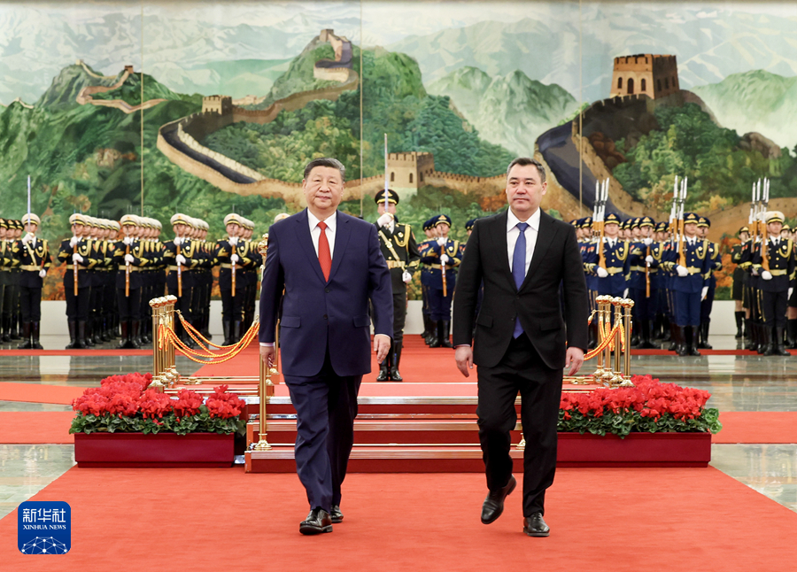 2月5日上午,國(guó)家主席習(xí)近平在北京人民大會(huì)堂同來華進(jìn)行國(guó)事訪問的吉爾吉斯斯坦總統(tǒng)扎帕羅夫舉行會(huì)談。這是會(huì)談前,習(xí)近平在人民大會(huì)堂北大廳為扎帕羅夫舉行歡迎儀式。