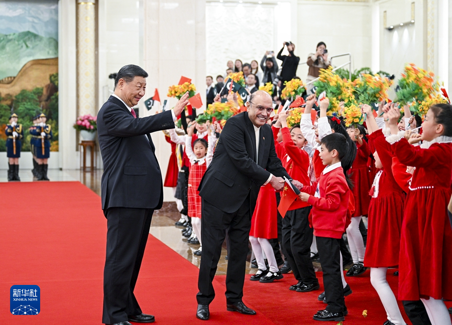 2月5日下午,國家主席習(xí)近平在北京人民大會堂同來華進行國事訪問的巴基斯坦總統(tǒng)扎爾達里舉行會談。這是會談前,習(xí)近平在人民大會堂北大廳為扎爾達里舉行歡迎儀式。