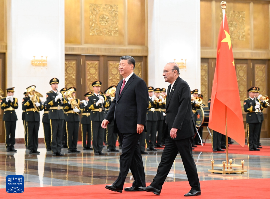 2月5日下午,國家主席習(xí)近平在北京人民大會堂同來華進行國事訪問的巴基斯坦總統(tǒng)扎爾達里舉行會談。這是會談前,習(xí)近平在人民大會堂北大廳為扎爾達里舉行歡迎儀式。
