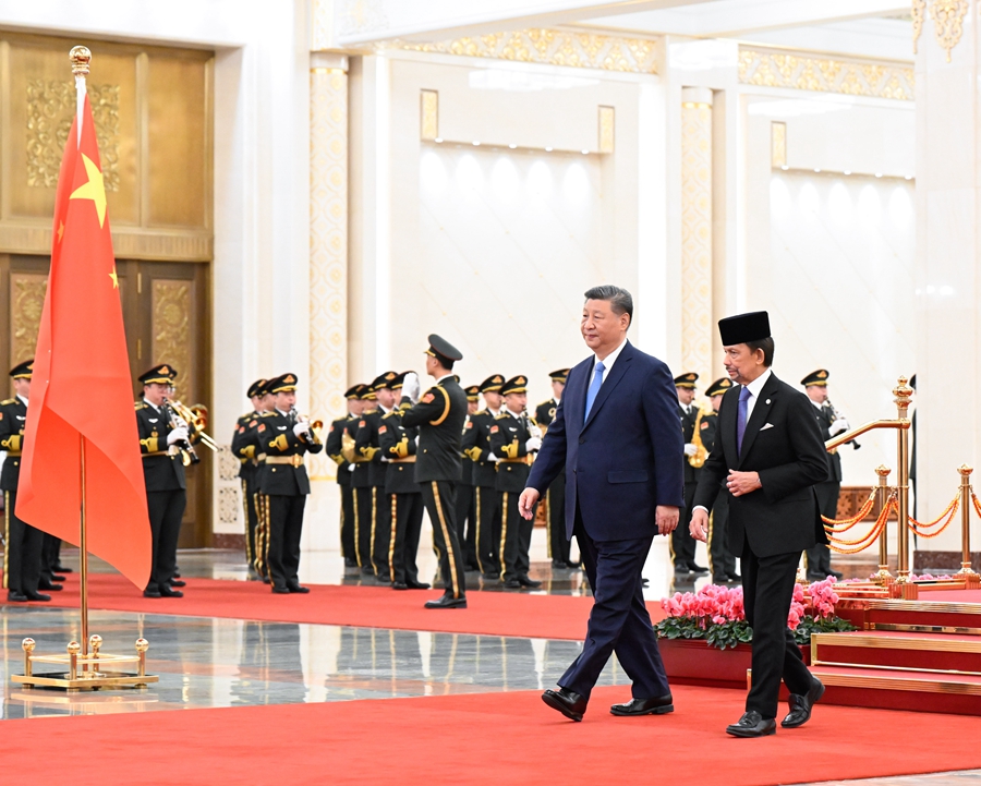 2月6日上午,國家主席習(xí)近平在北京人民大會堂同來華進(jìn)行國事訪問的文萊蘇丹哈桑納爾舉行會談。這是會談前,習(xí)近平在人民大會堂北大廳為哈桑納爾舉行歡迎儀式。