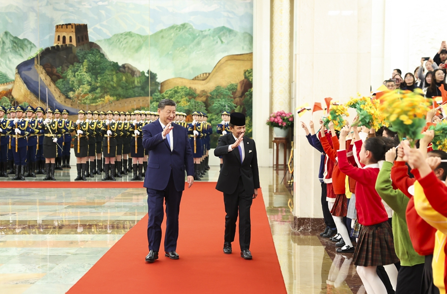 2月6日上午,國(guó)家主席習(xí)近平在北京人民大會(huì)堂同來華進(jìn)行國(guó)事訪問的文萊蘇丹哈桑納爾舉行會(huì)談。這是會(huì)談前,習(xí)近平在人民大會(huì)堂北大廳為哈桑納爾舉行歡迎儀式。