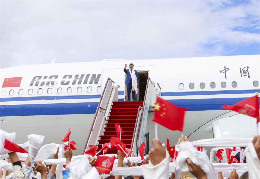 8月21日,中共中央總書記、國家主席、中央軍委主席習(xí)近平在拉薩出席西藏自治區(qū)成立60周年慶?;顒雍螅藢C(jī)返回北京。這是習(xí)近平在拉薩貢嘎機(jī)場向前來歡送的各族群眾揮手致意。