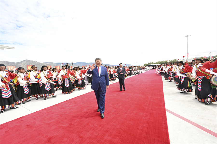 8月21日,中共中央總書記、國家主席、中央軍委主席習(xí)近平在拉薩出席西藏自治區(qū)成立60周年慶?;顒雍?,乘專機返回北京。這是習(xí)近平在拉薩貢嘎機場向前來歡送的各族群眾揮手致意。