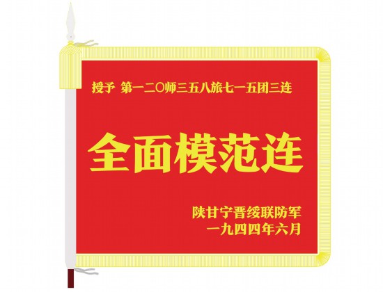 簡介:1943年,八路軍第120師358旅715團3連先后參加 “延安整風”和大生產、大練兵運動,廣泛開展軍事民主,全連官兵軍政素質、技戰(zhàn)術水平顯著提高,圓滿完成各項戰(zhàn)斗任務,超額完成大生產任務,涌現(xiàn)出一批先進典型。1944年6月,陜甘寧晉綏聯(lián)防軍授予該連“全面模范連”榮譽稱號。
