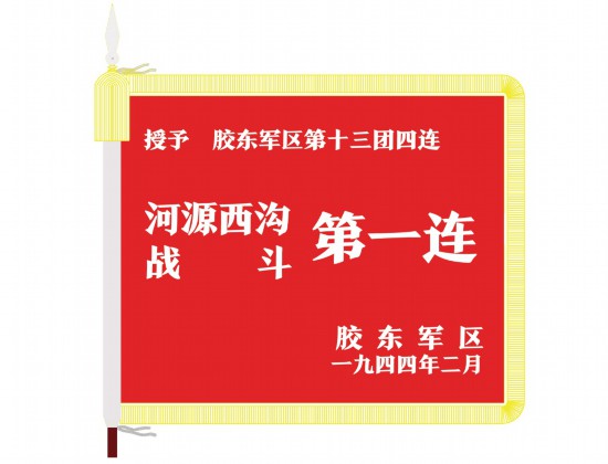 簡介:膠東軍區(qū)第13團(tuán)4連,1944年2月在萊西縣河源西溝戰(zhàn)斗打響后,迅速破壞敵防御工事、架設(shè)浮橋,給偽軍以突然襲擊;戰(zhàn)至天亮,偽軍龜縮到碉堡內(nèi),連隊(duì)?wèi)?zhàn)士王克山在戰(zhàn)友掩護(hù)下將碉堡炸毀,取得戰(zhàn)斗勝利。戰(zhàn)后,膠東軍區(qū)授予該連“河源西溝戰(zhàn)斗第一連”榮譽(yù)稱號。