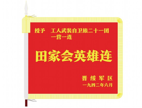 簡介:工人武裝自衛(wèi)旅21團(tuán)1營1連,1942年5月在田家會戰(zhàn)斗中擔(dān)負(fù)主攻任務(wù),與日軍反復(fù)沖殺、頑強(qiáng)作戰(zhàn),殲滅日軍一部并擊斃該部中隊(duì)長,繳獲敵文件、武器和指揮刀等,以較小犧牲取得較大勝利。戰(zhàn)后,晉綏軍區(qū)授予該連“田家會英雄連”榮譽(yù)稱號。