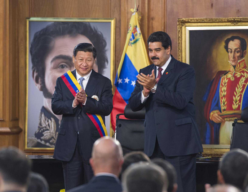 2014年7月20日,國(guó)家主席習(xí)近平在加拉加斯接受委內(nèi)瑞拉總統(tǒng)馬杜羅代表委內(nèi)瑞拉政府授予的“解放者”勛章。